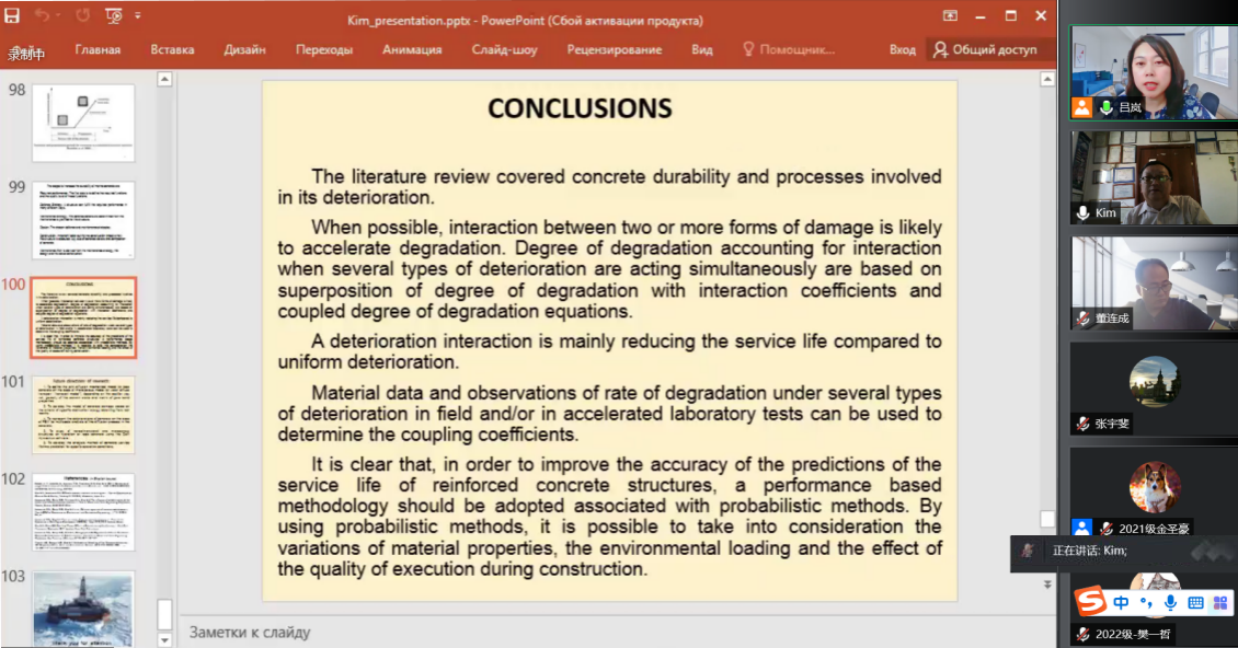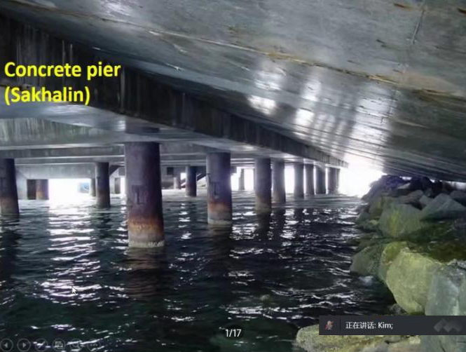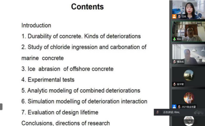 Kim教授的报告分别从混凝土劣化类型、海上混凝土平台冰磨损、实验室与现场实测数据处理、混凝土综合劣化分析模型、劣化过程仿真模型,以及混凝土结构使用寿命评估等六个方面展开。以“库页岛I号”、“库页岛II”号海上工程为背景,详细探讨了氯化物侵蚀、盐溶液运输、冻融循环等环境作用下混凝土结构的劣化特征与评估方法,还针对多种损伤耦合导致混凝土结构退化加速,以及结构使用寿命预测等问题进行了重点介绍。在互动环节中,MKsports教师Kim教授进行了沟通交流,在混凝土耐久性试验验证方法等方面开展了深入探讨。
