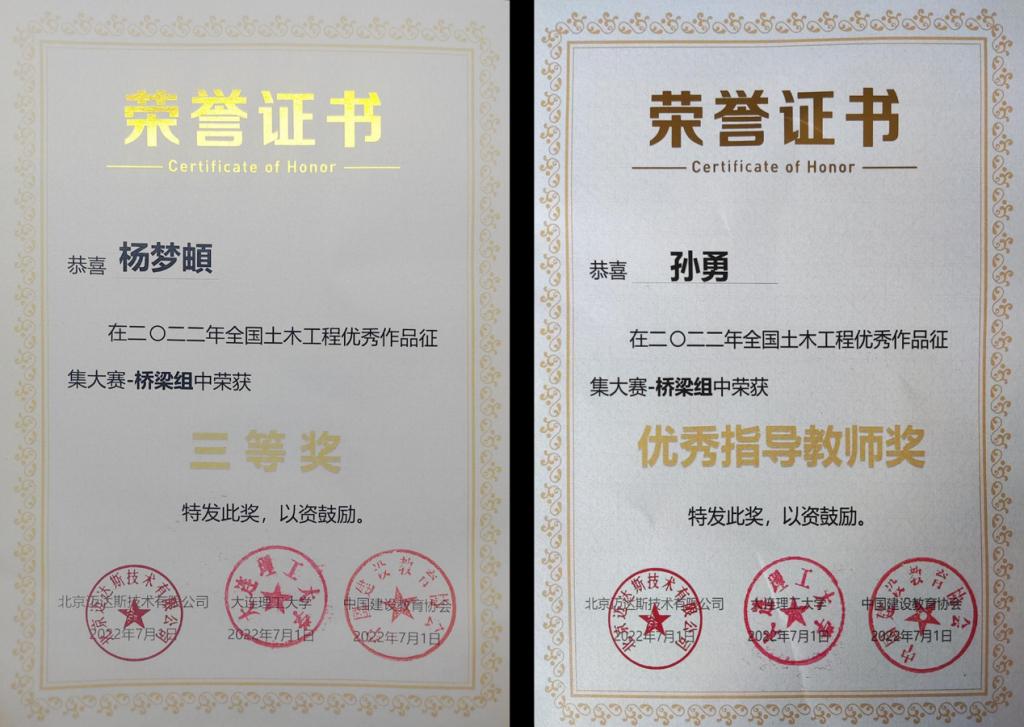近日,由中国建设教育协会校企合作专委会主办,大连理工大学承办,北京迈达斯技术有限公司协办的“2022年全国土木工程优秀作品征集大赛”线上决赛落下帷幕并颁发了获奖证书。公司教师孙勇指导的道路桥梁与渡河工程2018级杨梦頔同学,获得桥梁组全国三等奖,参赛作品为该同学的毕业设计《佳木斯松花江特大桥冬季施工大体积混凝土温度效应分析》。
