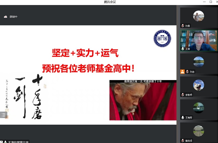 会上,王涛教授首先结合自己多年来坚持潜心研究、“十年铸剑”的亲身经历,同与会师生分享了关于申请国家自然科学基金的原始驱动力、申请前的准备工作、申请基金的心态、基金申请不能脱颖而出的原因等话题。随后,王涛教授针对在基金申请书撰写过程中的凝练科学问题、选题方法与原则、总体层次规划、申请书协作过程中常见问题,以及对摘要、关键词、立论依据、研究内容、研究目标与关键问题、研究方案与可行性分析、特色与创新之处等具体项目申报内容给出了详细的撰写建议。