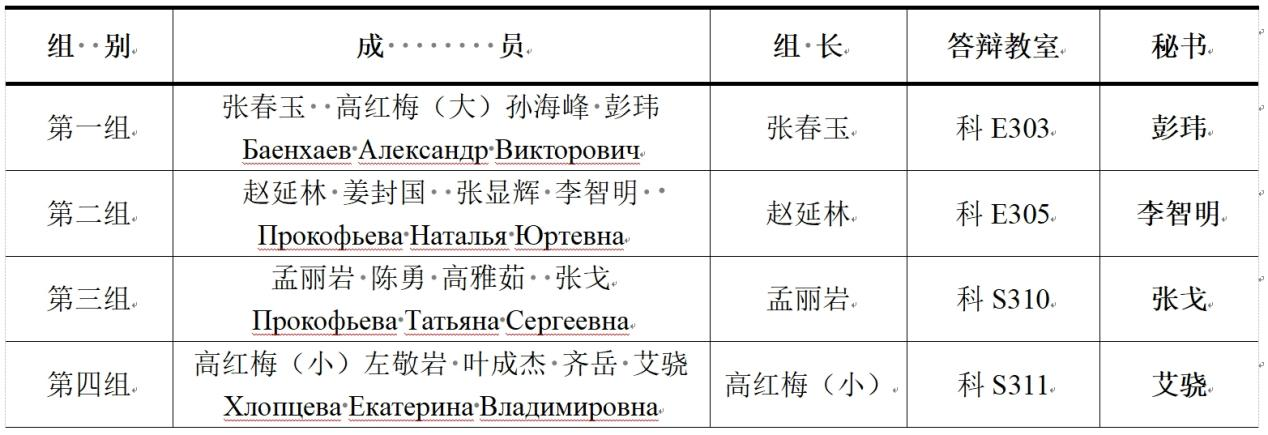 本次土木工程专业小组答辩分为四组,中俄土木小组答辩分为四组,每组还邀请了一名俄方老师参加,答辩分组见表1、表2。