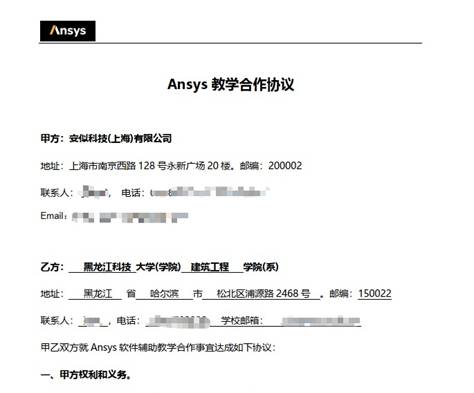 本次合作历经两个多月的接触、沟通并最终达成签约。按照约定:企业为公司上述两门课程提供软件使用授权、海量工程案例资源库、支持基于ANSYS系列软件的课外培训业务、认证ANSYS教学合作点与ANSYS教学和培训基地,并优先支持建立ANSYS创新仿真工程师考试中心等;公司为企业提供上述两门课程的课程大纲、课堂教学中开展的ANSYS软件案例教学、教学辅助算例,并允许企业在市场宣传与客户培训中使用。