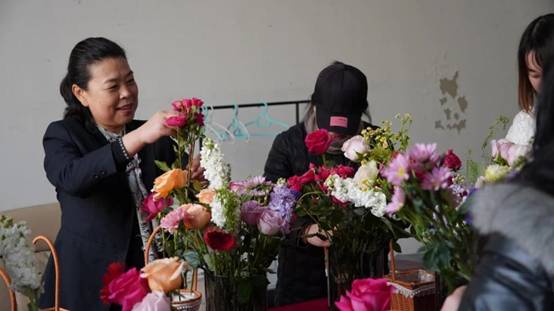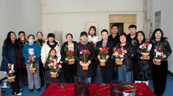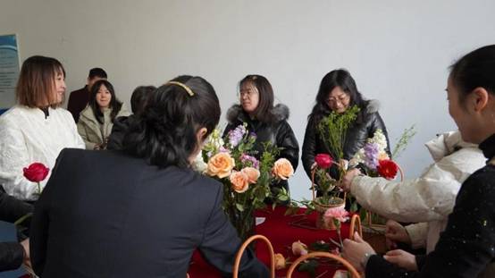 活动开始,首先进行的是插花环节。现场摆放着各式各样的鲜花和工具,女老师们围坐在一起,认真挑选着自己心仪的花材,精心构思着作品的造型。大家根据花材的高低、颜色进行搭配,创作出一束束独具特色的插花作品。